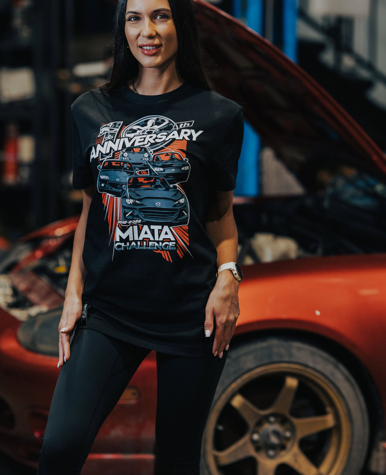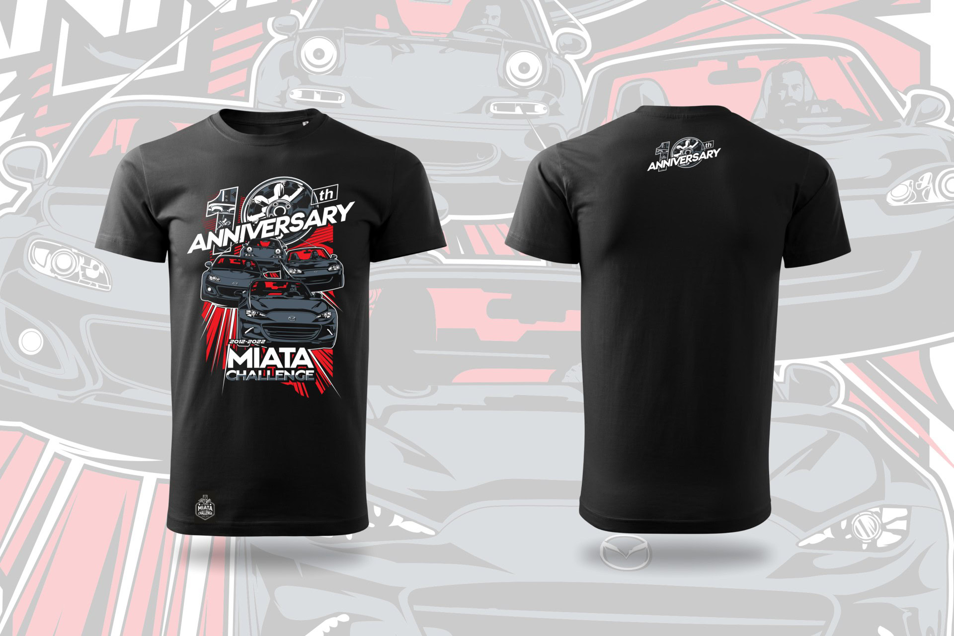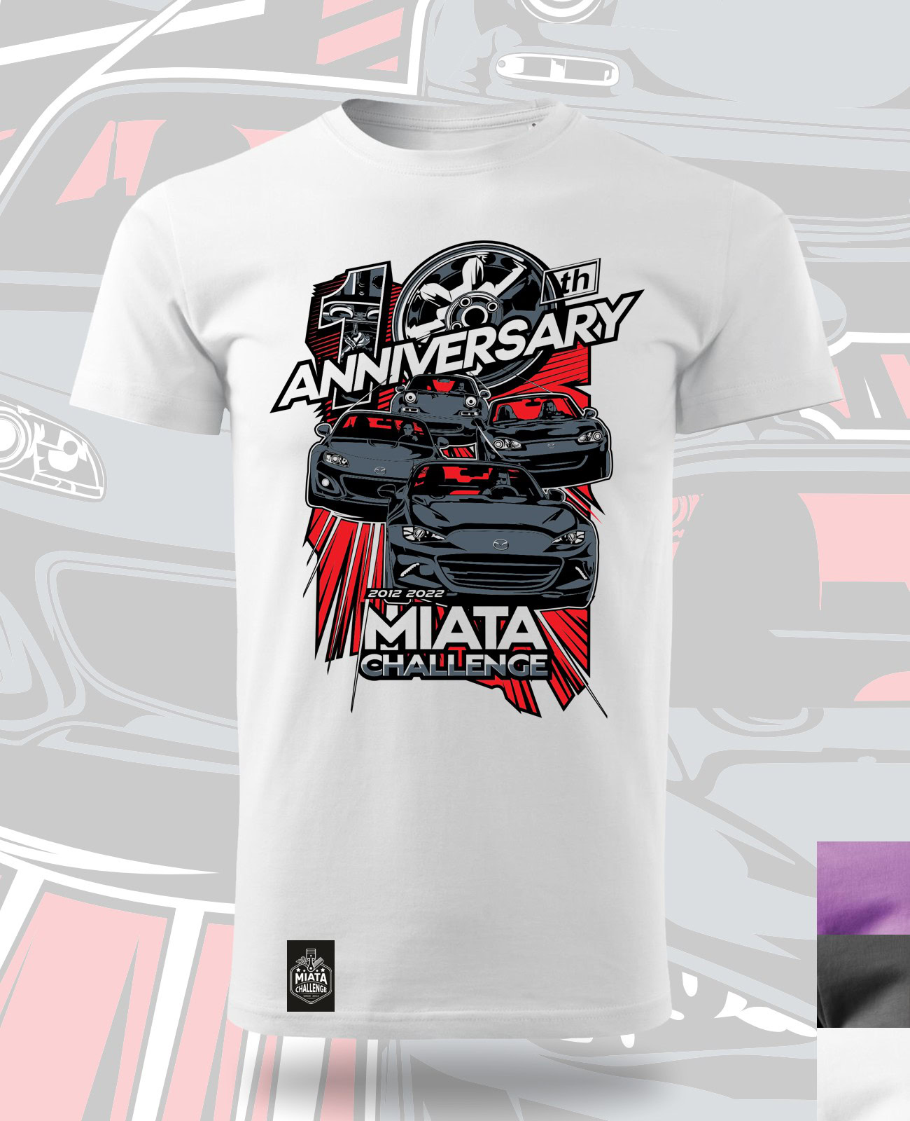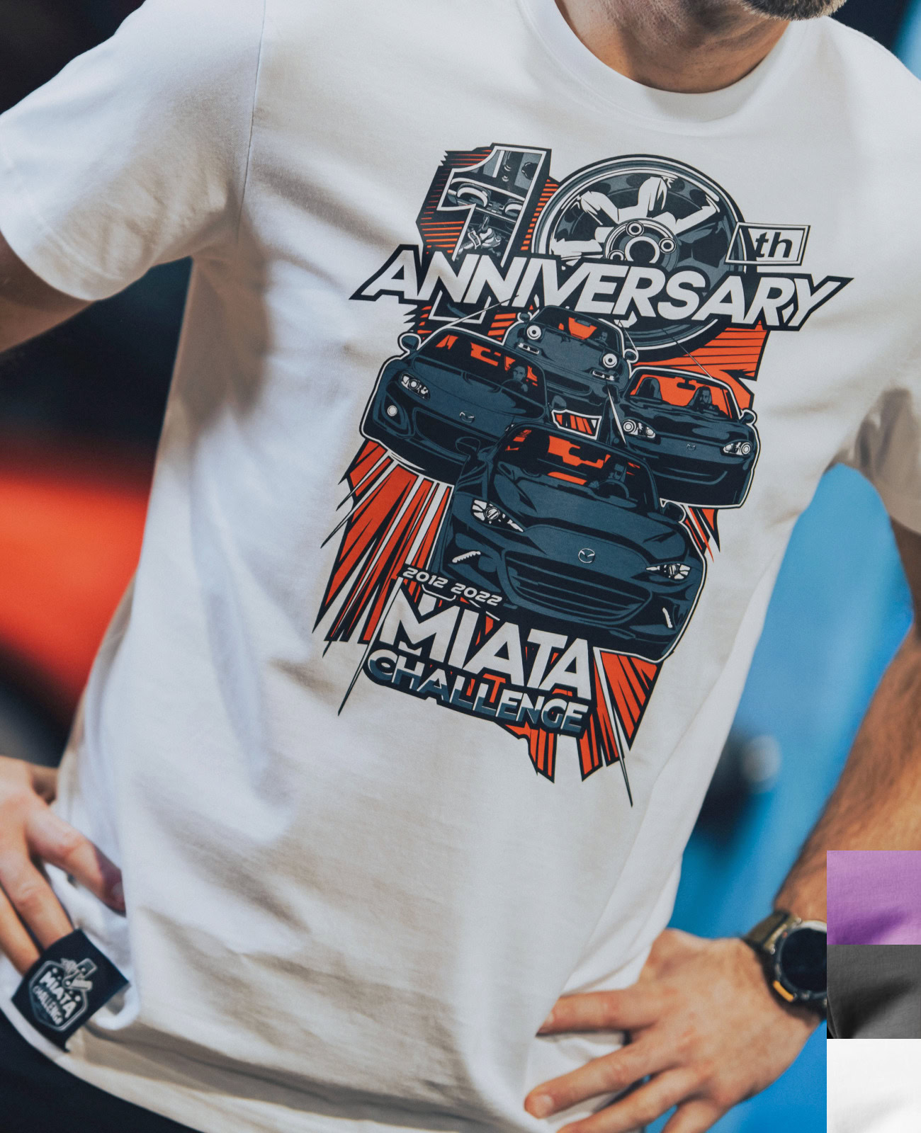 To celebrate the 10th Anniversary of Miata Challenge (2012โ2022), we created a special edition T-shirt that honors a decade of racing, passion, and the legendary Mazda MX-5.